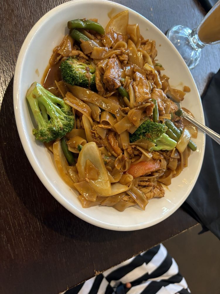 Special see-u sauce, Thai flat noodle, egg, broccoli, and carrot.