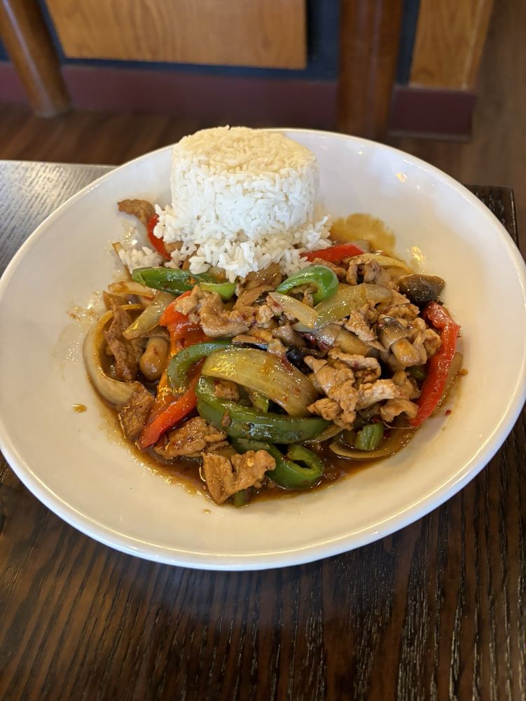 Thai chili sauce, pork tenderloin, red, and green bell pepper, sweet onion, and straw mushroom.