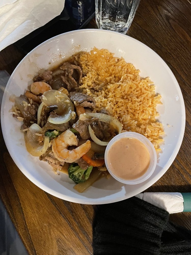 Thai BBQ sauce, 1/2 marinated chicken, fried rice, and shrimp. Add meat or veggies for an extra charge.
