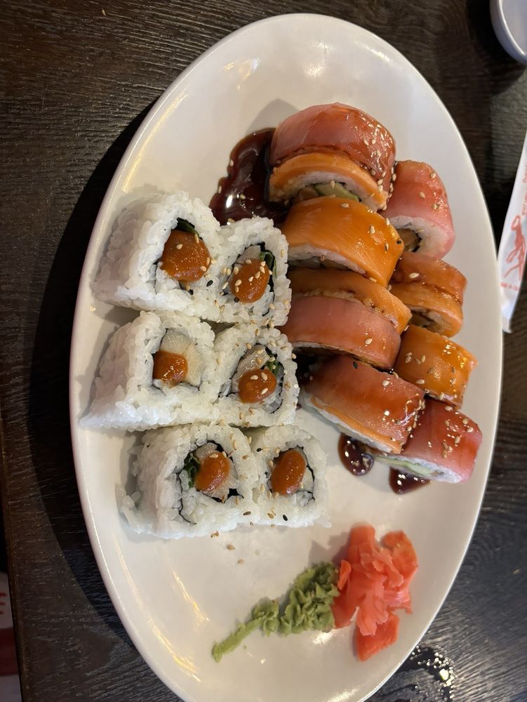 Yellowtail, tuna, cucumber, crab topped with salmon, kabayaki sauce, spicy Sriracha sauce, and spicy wasabi tobiko sauce on the side.