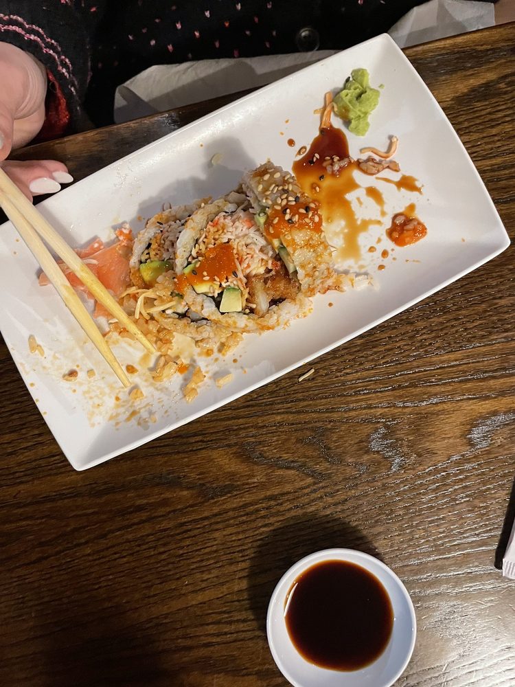 Shrimp tempura, cucumber, snow crab, avocado topped with masago, kabayaki sauce, and spicy Sriracha sauce.
