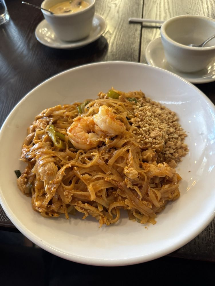 Special pad Thai sauce, shrimps, chicken, egg, thin Thai noodle, bean sprout, scallions, and peanuts.